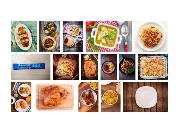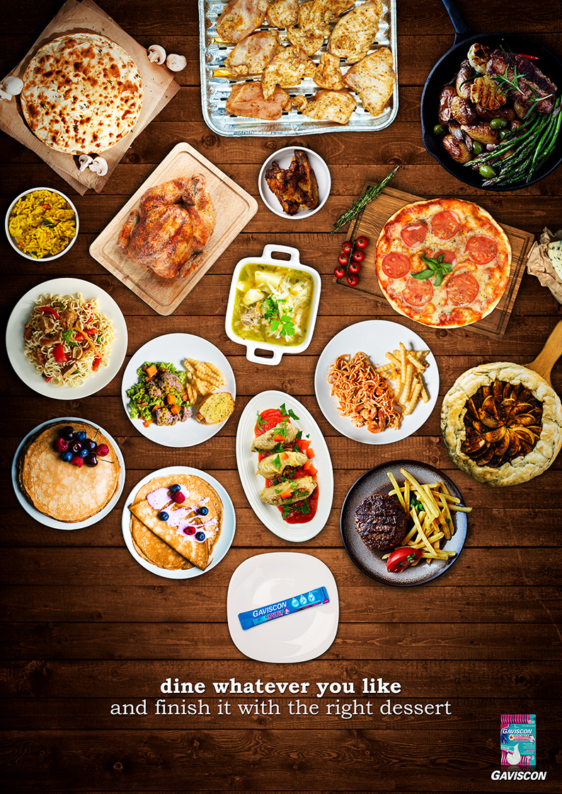 Concept and Design: Our design showcases an array of tempting foods alongside a reassuring pack of Gaviscon. With just 17 images, including original captures, we assure you this design convey meaning: indulge in your favourite dishes without concern for indigestion.