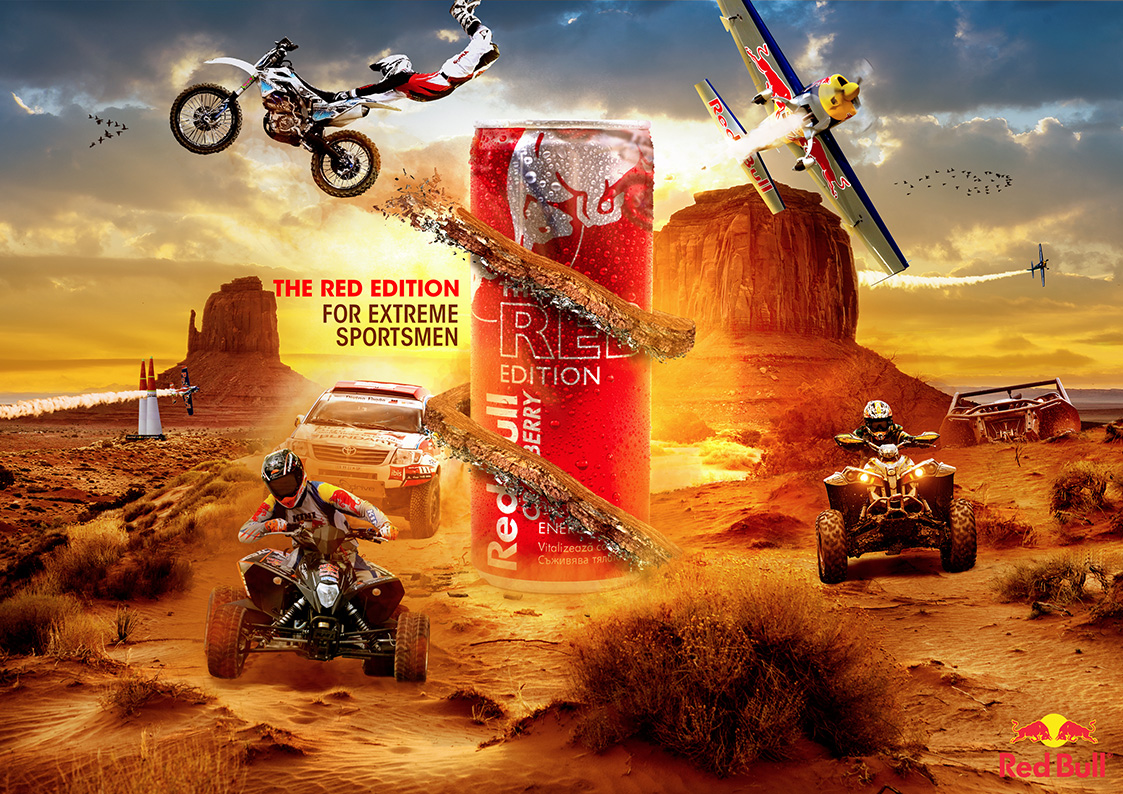 Concept and Design: Presenting a dynamic design tailored for extreme sports enthusiasts: the Red Bull Red Edition surrounded by action-packed sport characters racing around it. Crafted over 14 hours, this composition required expert compositing of 17 diverse images. The challenge was met with precision and creativity, resulting in a vibrant and captivating visual that embodies the energy and excitement of extreme sports. Get ready to unleash your inner thrill-seeker with the Red Bull Red Edition.